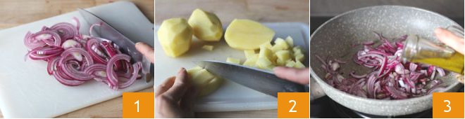 When the onion is soft, add the cubed potatoes 4, salt, and continue cooking for 10 minutes over high heat. As soon as the potatoes are soft 5, turn off the heat and slightly mash the potatoes with a fork 6.