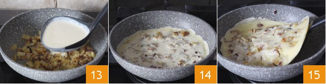 add 1/4 of the cooked potatoes and mash with a fork, spreading them across the entire bottom. Pour a ladle of batter over the potatoes 13 and swirl the pan to distribute it well 14. Cook the crepe on moderate heat, and when it starts to peel away from the edges, flip it to the other side with a spatula 15.