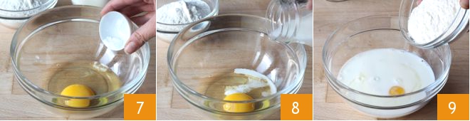 In the meantime, crack the egg into a bowl, add a pinch of salt 7, the milk 8, and half of the flour 9.
