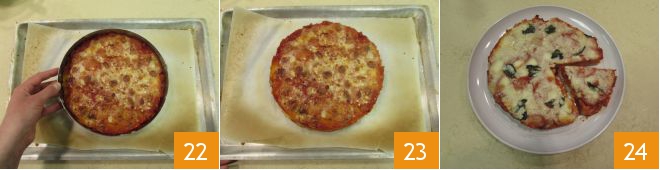 Add the grated Parmesan cheese 19, covering the entire surface 20. Add a few basil leaves and bake in a static oven at 392°F for 25 minutes. Then take it out of the oven 21