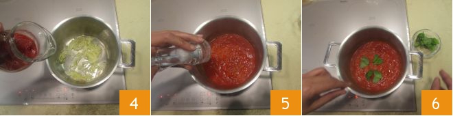 Let the onion brown, add the tomato sauce 4, season with salt 5 and let it cook for a few minutes, stirring often. Add a few basil leaves and turn off the heat 6.
