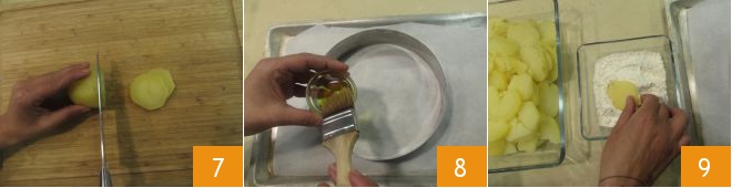 Take the potatoes and cut them into thick slices 7 and season them with salt. Then place a 8-inch ring on a baking sheet lined with parchment paper and grease it 8. Pass the potatoes one at a time in the flour 9