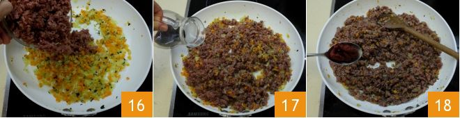 Pour the cotechino meat into the pan with the soffritto 16, stir with a wooden spoon. After a few minutes, deglaze with red wine 17, stir and let the wine evaporate. Then add the tomato paste 18 and continue cooking for about 15 minutes.