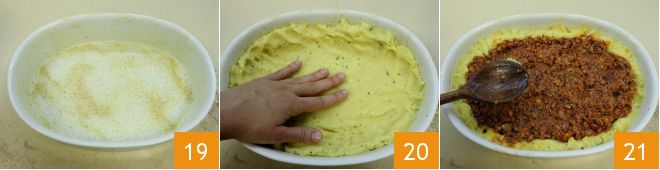 When the ragù is ready, you can start assembling the potato pie: take an oval baking dish, brush it with a little oil and sprinkle with breadcrumbs 19. Then lay down a layer of potatoes, making it adhere to the edges. Pour the cotechino ragù on top and flatten with the back of a spoon.