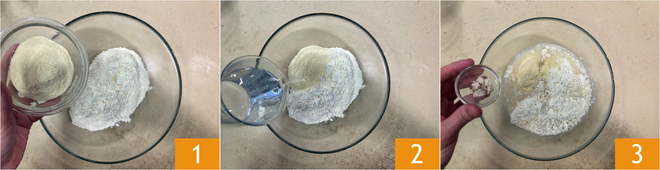 To prepare the potato pizza, pour the flours into a bowl 1 together with the water 2 and the crumbled yeast 3.