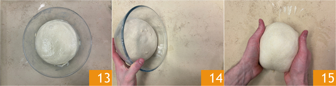 Take the risen dough 13. Turn it out onto a work surface 14 or bench lightly sprinkled with oil and give the final folds 15.