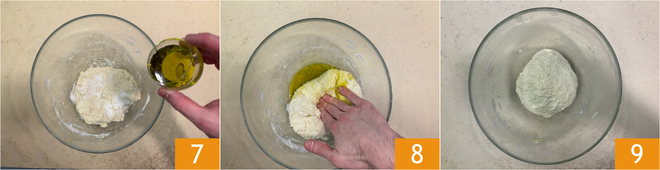 Also add the oil 7 and knead vigorously 8 until the two ingredients are fully absorbed 9.