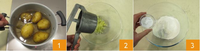 To make the potato plumcake, first boil the potatoes for 30-40 minutes, until they are tender 1; cooking time may vary depending on the size of the potatoes. Once cooked, pass them through the potato masher while still hot to reduce them to puree 2. In a bowl, pour the flour, baking powder 3, and salt.