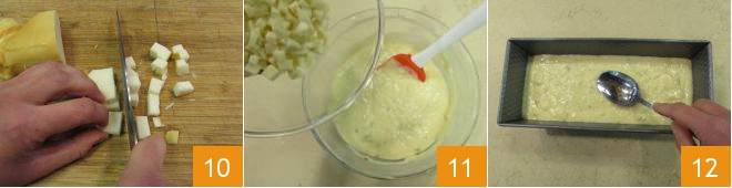 Cut the smoked provola cheese into cubes about 0.4 inches 10 and add it to the mixture 11. Mix and pour the batter into a greased and floured 10x4x2.75 inch plumcake mold, then level the surface with the back of a spoon 12.