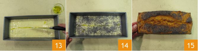 Grease a small knife with olive oil and then score the center of the batter along its length 13: this will prevent the surface from cracking during baking. Cover with poppy seeds 14 and bake in a preheated static oven at 356°F for 60 minutes in the middle rack. Once baked, remove the potato plumcake from the oven, let it cool slightly, then unmold it to serve 15.