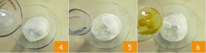 Also add the room temperature milk 4. Continue by pouring in the water 5 and the eggs 6.