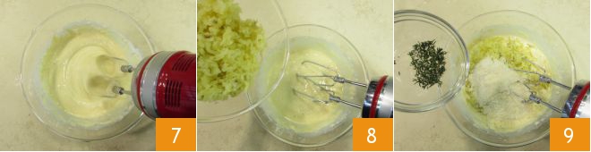 Work with electric beaters until the eggs are fully absorbed 7. At this point, add the cooled potato puree 8 and season with thyme leaves and grated cheese 9.