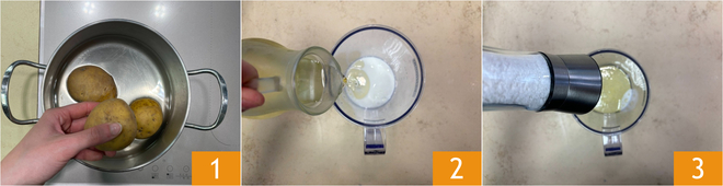 To prepare the potato spirals, first boil the potatoes starting from cold water, for about 30-40 minutes until they are soft 1. Meanwhile, prepare the crispy pepper mayonnaise: pour the milk and cold sunflower oil into a jug 2, then add salt 3.
