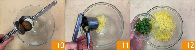 Drain the cooked potatoes, press them while still hot with a potato masher 10, and gather the puree in a bowl 11. Season with fresh marjoram leaves 12.