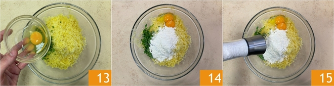 Add the whole egg 13 and the yolk, then add the flour 14 and salt 15.