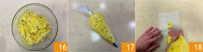 Mix the mixture until it's combined 16, then transfer it into a pastry bag with a 1/2 inch or 1/2 inch nozzle 17. Cut squares from parchment paper measuring 4x4 inches and squeeze the dough starting from the center 18.