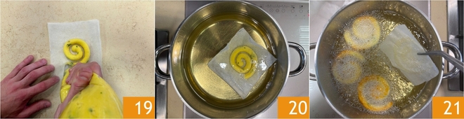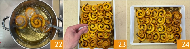 You should form spirals 19. Heat the sunflower oil in a saucepan and once it reaches 356°F, immerse the parchment paper sheets with the spirals 20, then use tongs to remove the paper 21. Fry a few pieces at a time to avoid lowering the oil temperature.