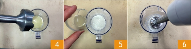 Immerse the immersion blender 4 and blend at medium speed until the mixture thickens. At this point, add the lemon juice 5 and blend again for a few seconds 6.