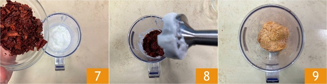 Add the crumbled crispy peppers 7, blend again to mix 8, and set aside the obtained mayonnaise 9.