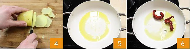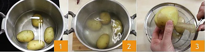 To prepare the potatoes and crunchy peppers, start by boiling the potatoes for 10 minutes 1 (it will take 5 minutes if using a pressure cooker) so they soften but do not break apart 2. Peel the potatoes 3