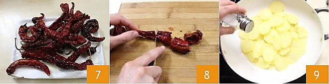 Drain the crispy peppers on a tray lined with paper towels 7. Cut the crispy peppers into not-too-small pieces 8 and set them aside. Now cook the potato slices over high heat in the same pan and the same cooking oil used for the peppers 9.