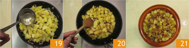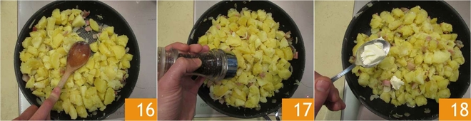 Crush some of the potatoes using a ladle 16, season with pepper 17 and salt. Then add the remaining butter 18.