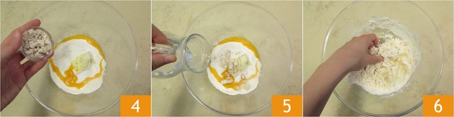 Also add the crumbled yeast 4 and most of the water 5. Mix to combine the ingredients 6. If the mixture seems a bit too stiff, you can add the remaining water. Do not overwork the dough; the important thing is that it is homogeneous.