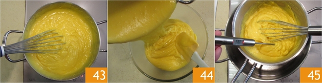 Return the saucepan to the heat and stir continuously until the cream reaches the first boil and begins to form lines 43. At this point, turn off the heat and pour the cream into a bowl 44 that you will immerse in a larger bowl filled with ice water. While waiting for it to cool, stir occasionally to prevent a skin from forming on the surface; the consistency should be smooth and creamy, not compact 45. Once cold, transfer the pastry cream to a piping bag without a nozzle and refrigerate.