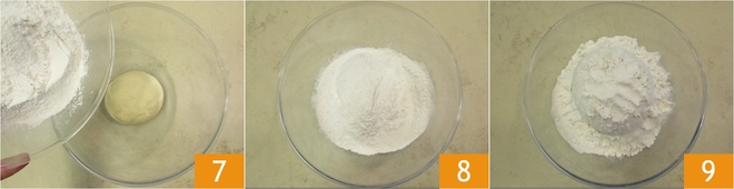 Form a ball and cover it with the 2.75 cups of flour needed for the second dough 7, then let it rise for 1-1.5 hours 8; this way, no skin will form on the surface. During the rising time, the biga should almost triple in volume 9.
