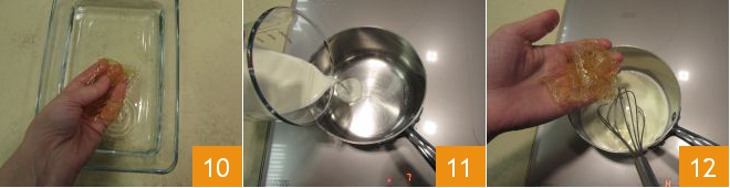Meanwhile, prepare the cream. Soak the gelatin in fresh water 10 and in the meantime, heat the cream in a saucepan but do not bring it to a boil 11. As soon as it is sufficiently hot, drain the gelatin and immerse it in the cream. Mix well with a whisk, being very careful so that there are no lumps: if this happens, just put it back on the heat for a moment 12.