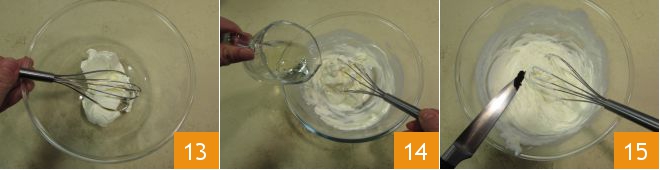 While the mixture cools down a bit, pour the fresh cheese into another bowl and work it for a few moments with a whisk 13. Then add the prosecco 14, the seeds extracted from the vanilla pod 15