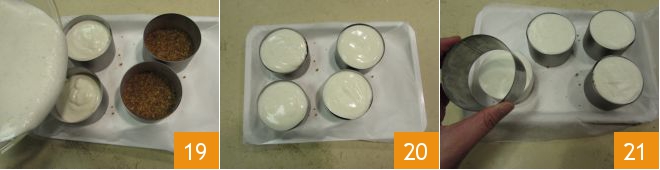 and mix 7. Transfer the mixture into 4 molds of 3 inches in diameter and 1.75 inches in height placed on a tray with parchment paper. Also, be sure to line the circumference with acetate or parchment paper 8. Flatten well with the back of a spoon and transfer to the refrigerator for 30 minutes 9.