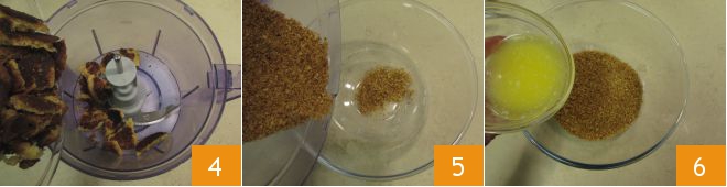 Transfer the pieces to a food processor and make very small crumbs by activating the blades 4. Pour them into a bowl 5, add the melted butter 6