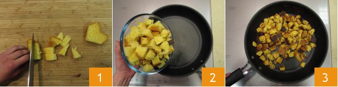 To prepare the prosecco cheesecake, start with the pandoro base. Cut it into pieces of about half an inch 1 and place them in a non-stick pan. Cook the pandoro pieces for 7-8 minutes over medium heat, stirring frequently 2, to prevent them from burning. The pandoro should just be dry, golden, and well-toasted 3.