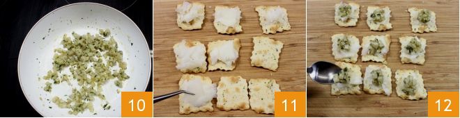 When the Jerusalem artichoke is cooked, turn off the heat 10 and on a cutting board arrange the olive puff pastries. Add a slice of raspadura 11 (you can also shave thin slices directly from the Grana cheese). On each pastry also add a teaspoon of sautéed Jerusalem artichoke 12 and if you wish, you can garnish with a pinch of chopped parsley before serving the puff pastries with olives, Jerusalem artichoke, and raspadura!