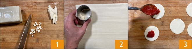 To prepare the puff pastry mini pizzas in air fryer, first cut the pizza mozzarella into very small cubes 1. Now unroll the puff pastry and cut out circles with a pastry cutter 2.5 inches in diameter 2. Place the puff pastry discs on the cutting board and top them with the tomato sauce 3.