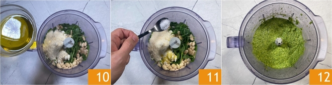 Finally, add the oil 10 and salt 11 and blend until you achieve a creamy but fairly rustic consistency 12.