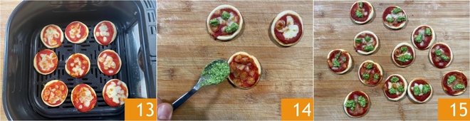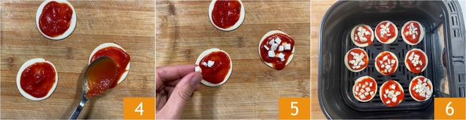 Spread evenly using the back of a spoon 4, then add the mozzarella cubes 5. Transfer the topped mini pizzas to the air fryer basket 6 and cook at 300°F for 6 minutes.