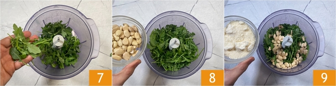Meanwhile, make the arugula pesto: place the washed and dried arugula in a mixer with blades 7, then add the peeled almonds 8 and grated Pecorino cheese 9.