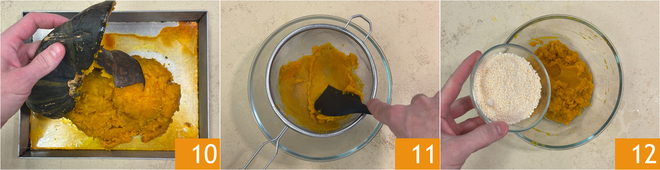 Bake in a preheated static oven at 400°F (200°C) for about 45 minutes. When the pumpkin is soft, remove the skin 10 and mash the flesh; for a smooth and creamy consistency, you can sieve it with a strainer 11. Add the grated cheese 12.