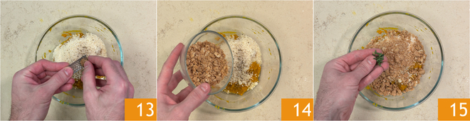 Also add the grated nutmeg 13, crushed amaretti 14, and stripped thyme 15.