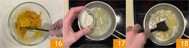Mix well, then transfer the filling into a piping bag and refrigerate for about twenty minutes 16. Meanwhile, prepare the fondue: melt the butter in a small saucepan, then add the flour 17. Mix well with a spatula, making sure the flour doesn't burn; it will take a couple of minutes 18.
