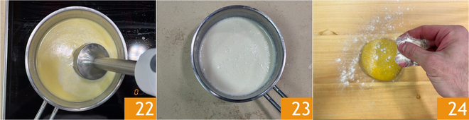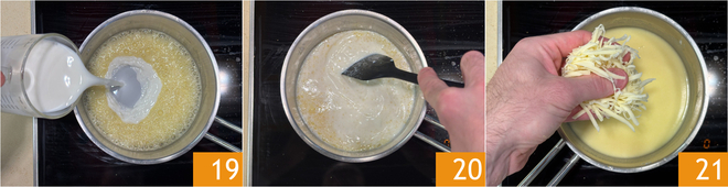 When the flour is toasted, pour in the milk little by little 19 and continue stirring over low heat 20. As soon as it starts to simmer, add the previously grated smoked provola 21.