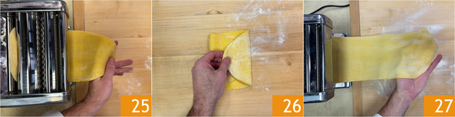 Roll out the dough with a pasta machine, starting from the widest roller setting 25 and gradually reducing it, folding the sheets in between to reinforce them 26. Continue to roll out the dough until it reaches a thickness of about 0.04 inches (1 mm) 27.