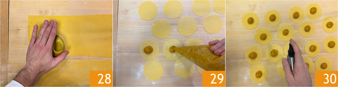Using a pastry cutter with a diameter of 7-8 cm, cut out discs 28, then squeeze a tuft of pumpkin and amaretti filling in the center of each one 29. Spray a little water on the edges to facilitate sealing 30.