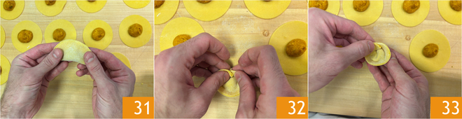 Fold the discs into half moons 31, then turn the ends until they meet and pinch them together 32. After forming all the cappellacci, cook them in lightly boiling salted water for a few minutes 33.