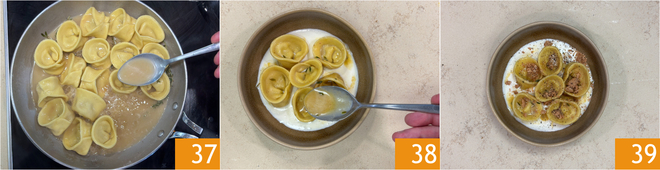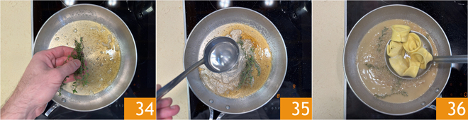 In the meantime, prepare the dressing: melt the butter in a pan over low heat, when it turns a nice hazelnut color, add the thyme 34 and a ladle of pasta cooking water 35. Gently swirl the pan to blend the dressing and make it creamy. Drain the cappellacci in the pan 36.