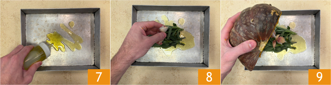 In the meantime, prepare the filling: on a baking tray, pour a little oil 7, then form a pile with the sage leaves and garlic cloves 8. Place the pumpkin, halved and seeded, cut side down, enclosing the flavors in the cavity 9.
