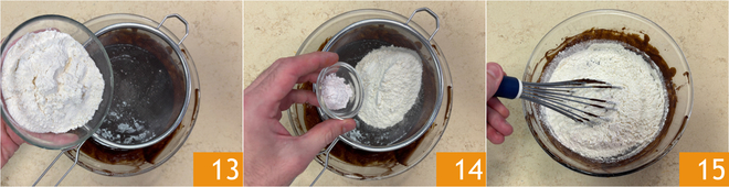 Sift the flour 13 and baking powder 14 into the bowl, then mix again 15 to incorporate the dry ingredients evenly and obtain a lump-free mixture.
