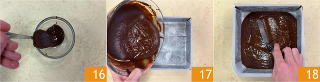 Set aside 40 g of batter for decoration 16. Pour the rest of the mixture into an 8x8 inch pan lined with parchment paper 17, level the surface 18, and set aside.